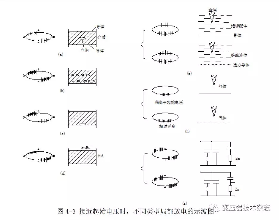 (d)中,(1 )一簇不同尺寸的氣隙位于電極的表面,但屬封閉型;(2 )電極與絕緣介質(zhì)的表面放電氣隙不是封閉的。放電脈沖疊加于電壓的止及負(fù)峰值之前兩邊幅值比通常為3:1,有時達(dá)10:1。隨電壓上升,部份脈沖向零位方 向移動.放電起始后,脈沖分辨率尚可;繼續(xù)升壓,分辨率下降直至不能分辨。放電起始后放電皇隨電壓的上升逐漸增大,熄滅電壓等于或略低于起始電壓。如電壓 持續(xù)時間在10 min以后,放電響應(yīng)會有些變化。