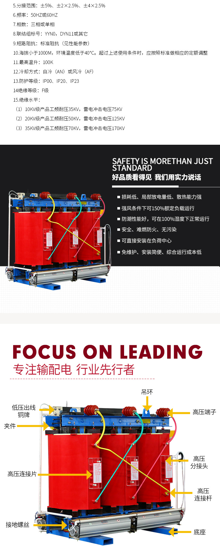 突出優(yōu)勢(shì):損耗低、節(jié)能、運(yùn)行經(jīng)濟(jì)、免維護(hù)、工藝結(jié)構(gòu)先進(jìn)、抗短路、雷電沖擊水平高外,還具有阻然、防潮、防塵、噪聲低等特點(diǎn)